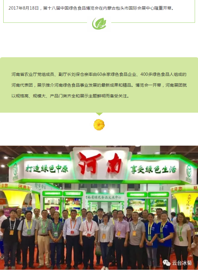 云臺(tái)冰菊不僅凸顯了河南綠色食品大家族、新發(fā)展和新形象,也為本屆博覽會(huì)“綠色理念、綠色生產(chǎn)、綠色消費(fèi)”主題貢獻(xiàn)了一己之力,受到蒞會(huì)領(lǐng)導(dǎo)、廣大市民、國(guó)內(nèi)外客商和各類媒體的廣泛關(guān)注和高度稱贊。